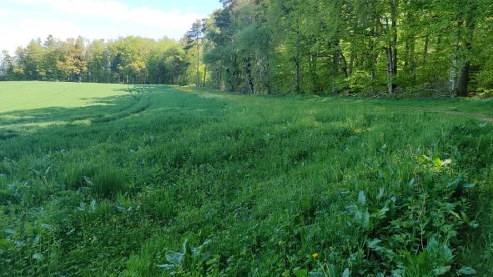 Schattige Standorte entlang von Waldrändern eignen sich nicht für die Anlage von Acker-BFF. Die Mischungsarten brauchen viel Sonnenlicht und das Risiko von Verbuschung ist hoch (Foto: Sophie Ortner, Grangeneuve).