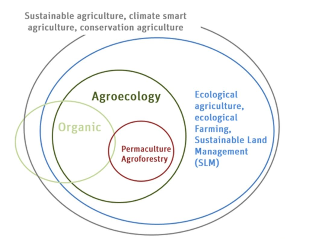 « La permaculture peut être considérée comme un mouvement agroécologique avec une approche spécifique de la conception, qui partage une vision systémique de la vie et des activités humaines. Les principes et les thèmes de la permaculture peuvent compléter ceux de l’agroécologie » et « l’agroécologie fournit le contexte politique et social du mouvement et est davantage ancrée dans les communautés agricoles », ainsi que « La voie de transition vers l’agroécologie à plus grande échelle (pour l’ensemble du système alimentaire) est bien élaborée […] et la permaculture offre une série d’outils pour la conception et la mise en œuvre de la transition au niveau de l’exploitation agricole ».