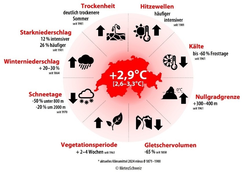 Die Schweiz ist als Binnenland besonders vom Temperaturanstieg betroffen, denn Landmassen erwärmen sich grundsätzlich schneller als Ozeane. Der landesweite durchschnittliche Temperaturanstieg liegt in der Schweiz 2025 bereits bei +2,9°C seit der vorindustriellen Zeit, während der weltweite Anstieg bei 1,5°C liegt.