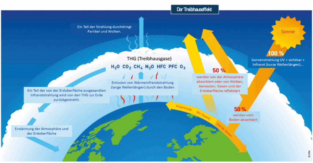 Die Atmosphäre verhält sich ähnlich wie die Wände eines Gewächshauses. Bei wolkenfreiem Himmel lässt sie den grössten Teil der Sonnenstrahlen durch, wodurch sich die Erdoberfläche erwärmt. Diese Erwärmung führt dazu, dass der Boden langwellige Infrarotstrahlen abgibt, die teilweise durch die Atmosphäre zurückgehalten werden – insbesondere durch Treibhausgase wie Wasserdampf und CO₂, die natürlicherweise in der Luft vorkommen (natürlicher Treibhauseffekt).