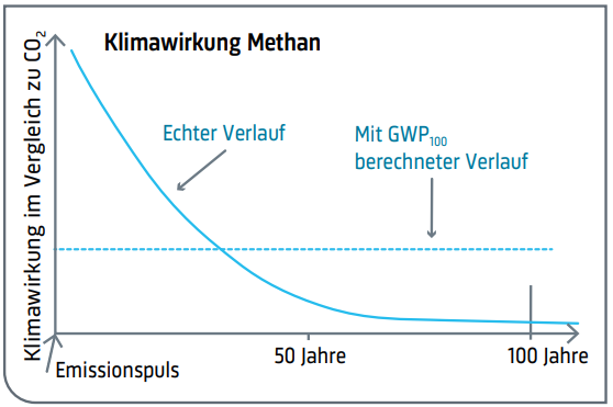 - GWP100 ist die aktuell am häufigsten verwendete Methode, um das Treibhauspotenzial von THG zu messen. GWP100 misst dabei die Klimawirkung über 100 Jahre und geht von einer konstanten Wirkung aus. Dies ist vor allem für langlebige Gase wie CO2 sinnvoll, führt jedoch für kurzlebige Gase wie Methan, das in der Atmosphäre rasch abgebaut wird, zu Verzerrungen. Die Klimawirkung von Methan wird in GWP100 entsprechend kurzfristig (erste Jahrzehnte) unterschätzt, längerfristig jedoch überschätzt.