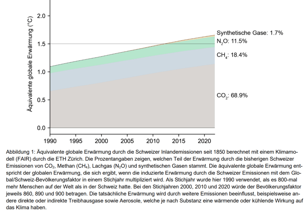 Heute trägt die landwirtschaftliche Produktion in der Schweiz 16% (2023) zu den nationalen Treibhausgasemissionen bei, wobei der grösste Teil auf die Emissionen von Methan durch Wiederkäuer (enterische Fermentation) und auf das Hofdüngermanagement zurückzuführen sind (BAFU).