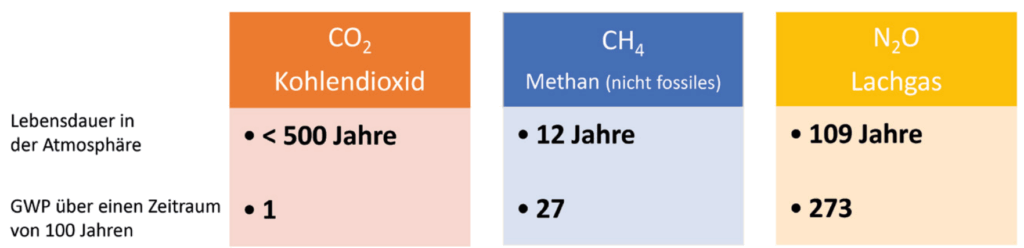 Die verschiedenen Treibhausgase wirken unterschiedlich stark auf die Klimaerwärmung und verbleiben unterschiedlich lange in der Atmosphäre. Kohlendioxid (CO₂) sammelt sich über sehr lange Zeiträume in der Atmosphäre an, wirkt dafür aber pro Einheit weniger stark erwärmend. Methan (CH₄) und Lachgas (N₂O) haben eine deutlich kürzere Lebensdauer, weisen jedoch ein deutlich höheres Treibhauspotenzial auf. Um diese Unterschiede vergleichbar zu machen, werden Emissionen oft in CO₂-Äquivalenten angegeben – also in der Menge CO₂, die dieselbe erwärmende Wirkung hätte wie eine bestimmte Menge eines anderen Treibhausgases über einen definierten Zeitraum (meist 100 Jahre). Bei der Bewertung von Treibhausgasemissionen und der Planung von Massnahmen zur Reduktion muss daher sowohl die Lebensdauer als auch das Erwärmungspotenzial berücksichtigt werden: