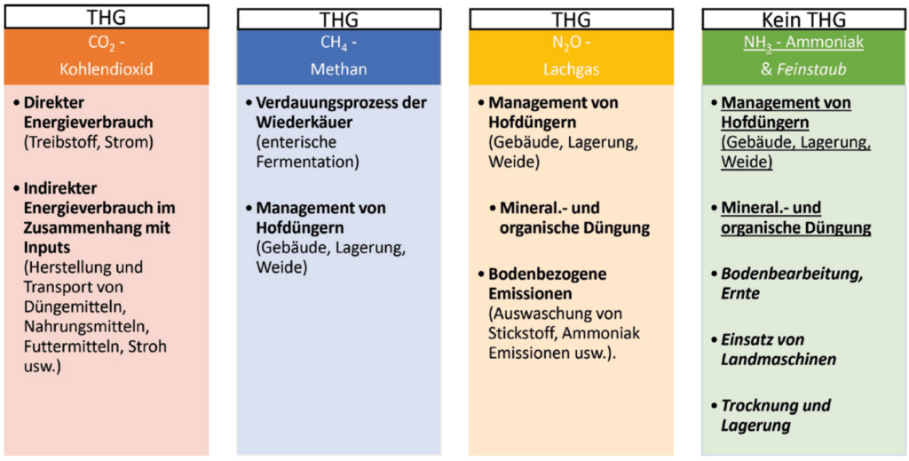 - Methan (CH₄): aus der Rindviehhaltung (enterische Fermentation) und der Lagerung von Hofdünger