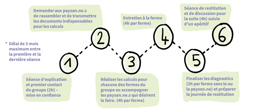 Synthèse des diagnostics : A la suite des entretiens, l’animateur-ice finalise l’acquisition des données si nécessaire et rédige des éléments de synthèse pour chacun des six thèmes du diagnostic, sur la base de l’entretien et des résultats chiffrés des indicateurs. Il est ensuite transmis aux fermes.