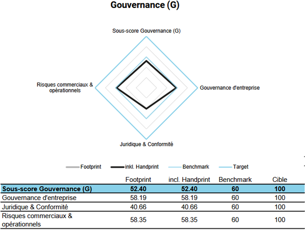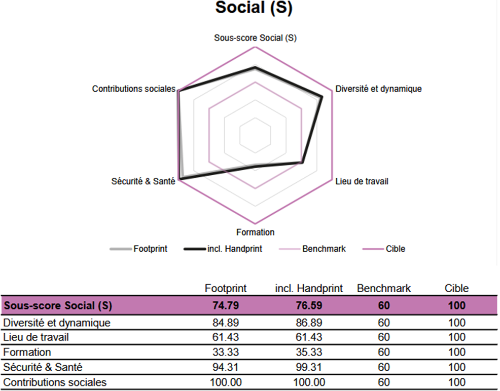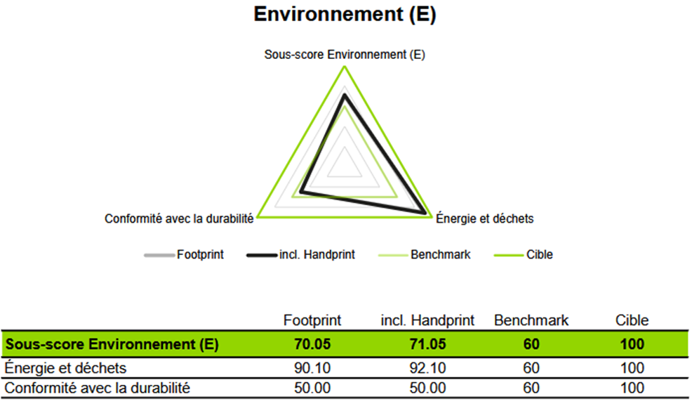Es wird ein holistischer Footprint-Score exkl. und inkl. Handprint präsentiert sowie Scores für die drei Main-Areas (Environment, Social und Governance).