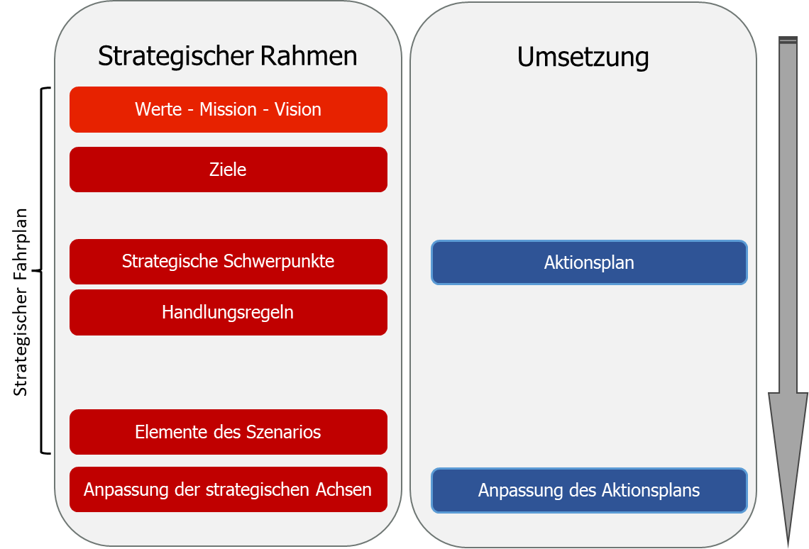 In dieser Hinsicht dient der strategische Rahmen als Referenz für alle Momente oder Aktivitäten des strategischen Reflektierens, Entscheidens oder Handelns. Zwischen diesen Aktivitäten besteht ein komplexes Kontinuum, und es ist ebenso gut möglich, mit der Umsetzung dieses strategischen Rahmens im Handeln zu „beginnen“.