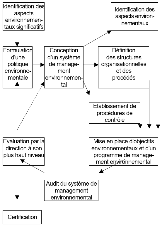 Depuis 1996, les entreprises peuvent faire certifier leur système de management environnemental selon la norme internationale de management environnemental ISO 14001. La norme a pour objectif l'amélioration continue de la performance environnementale. Pour ce faire, le système doit respecter les exigences suivantes :